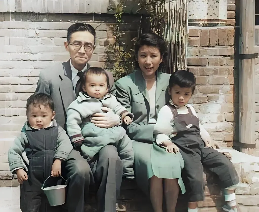 这个三娃一窝的场景太熟了,小院青砖当靠背,爸爸戴黑框眼镜,西装外套搭一件毛呢背心,妈妈穿绿色套裙,侧身抱着老二,最小的拎个小铁桶,眼睛圆圆的看镜头,老大一只脚搭着台阶,鞋面有点起褶,像刚跑过一阵游戏,画面没什么讲究的构图,却有生活在场的味道,奶奶说从前院子就是游乐场,砖缝里能蹿出一整天的笑声,现在孩子玩的东西花了眼,反倒少了这股自在。