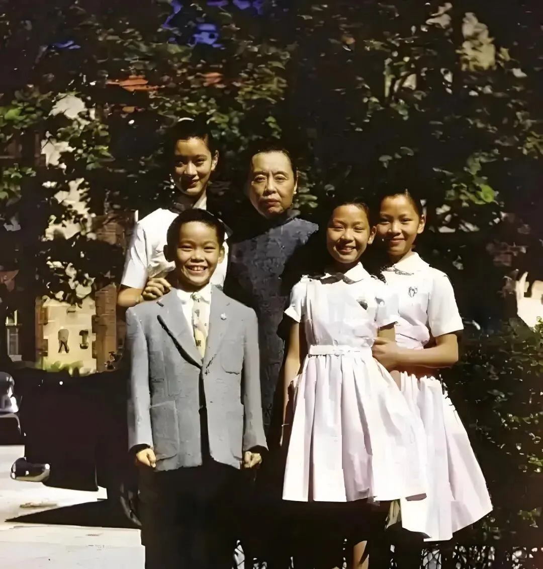 这个是长辈带娃的合影,树荫底下光影落得细碎,中间的老人面色沉静,周围三个孩子一左一右挨着站,前排那个小伙穿灰色小西装,笑得嘴角往上挑,两个姑娘穿白裙子,腰间细带打了个结,裙摆被风轻轻掀起一点,我小时候最怕站在中午的太阳下拍照,眼睛全被晒眯了,他们这张选得好,亮处打在脸蛋儿上,黑处收在树后,层次一分,人物就立住了。