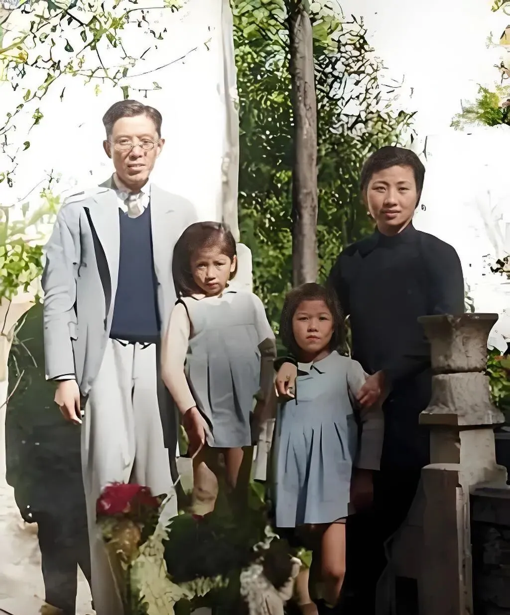最后这张叫四口之家,小园子里叶影摇摇,爸爸穿浅灰套装,裤线挺直,妈妈一身素黑长衫,袖口包得圆润,两个小姑娘穿着蓝灰色连衣裙,褶子从胸前一排排落下,站姿一个靠近父亲,一个贴着母亲,像两边的栀子把香气往中间送,画面不热闹,却很安静,我姥爷看这种照片最爱感叹一句,以前拍照讲究“穿净站稳看镜头”,现在人人都能抓拍,反倒少了这种慢工,慢工出的是一家子的气度。