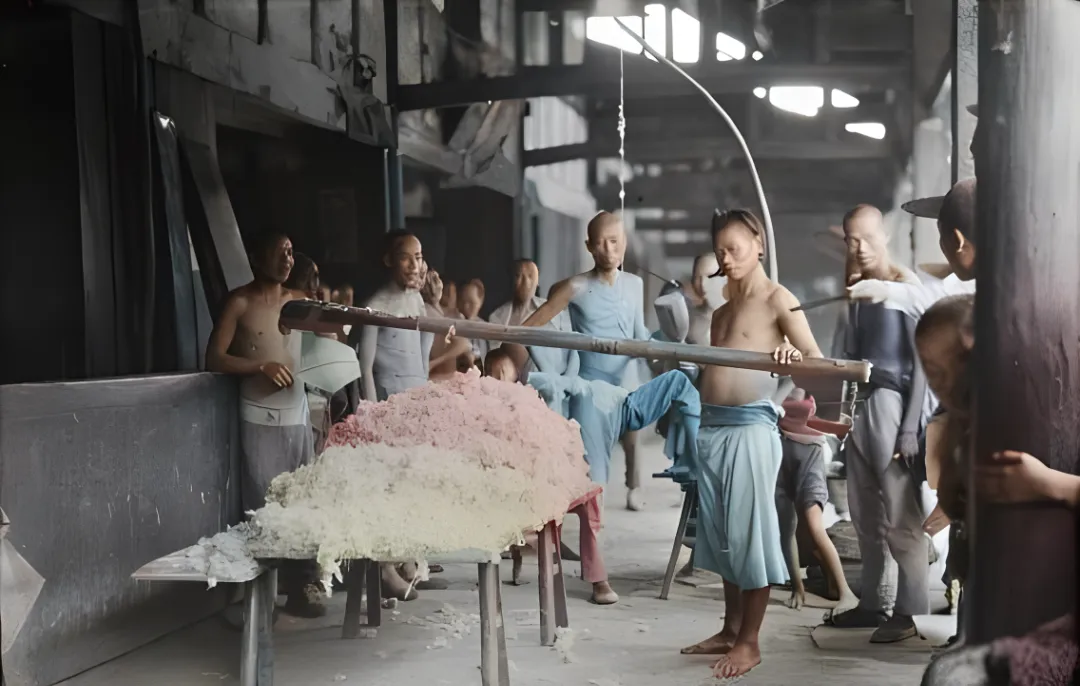 图中这根长长的木杆配着粗弦的家伙叫弹棉弓,工匠把弓弦一拨一挑,弦头上的小锤子嗡嗡地抖,棉朵就像起了云,炸得蓬松又细软,案板上堆着两色棉团,粉里透白,白里见亮,师傅赤膊上阵,左手压棉右手顺弓,节奏一快一慢,弦声在梁下回响,一下就把耳朵拽回老屋里。