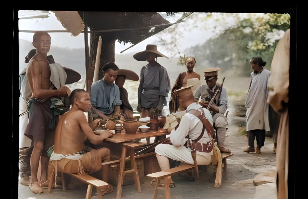 这个木桌木碗是赶路人歇脚的路边食摊,粗腿长凳,汤碗沿口已磨得发亮,画面里两位穿军装的坐得正,长枪立在身边,腰间挂着短刀,桌上有酱缸、茶壶、几碟小咸菜,旁边站着的挑夫衣衫单薄,手里还攥着驳壳似的饭票样的小纸头,老板往碗里舀汤的动作一抖一稳,汤面上冒着油星。