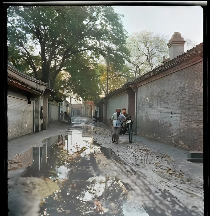 小时候我跟在大人后头进胡同,最爱听车轮压过积水的嘶嘶声,现在共享车满街跑,路也平了,水一摊就被雨箅子吞了,黄包车只在影像里穿行,真要是遇上一个拉车的老先生,非得多看两眼再走。