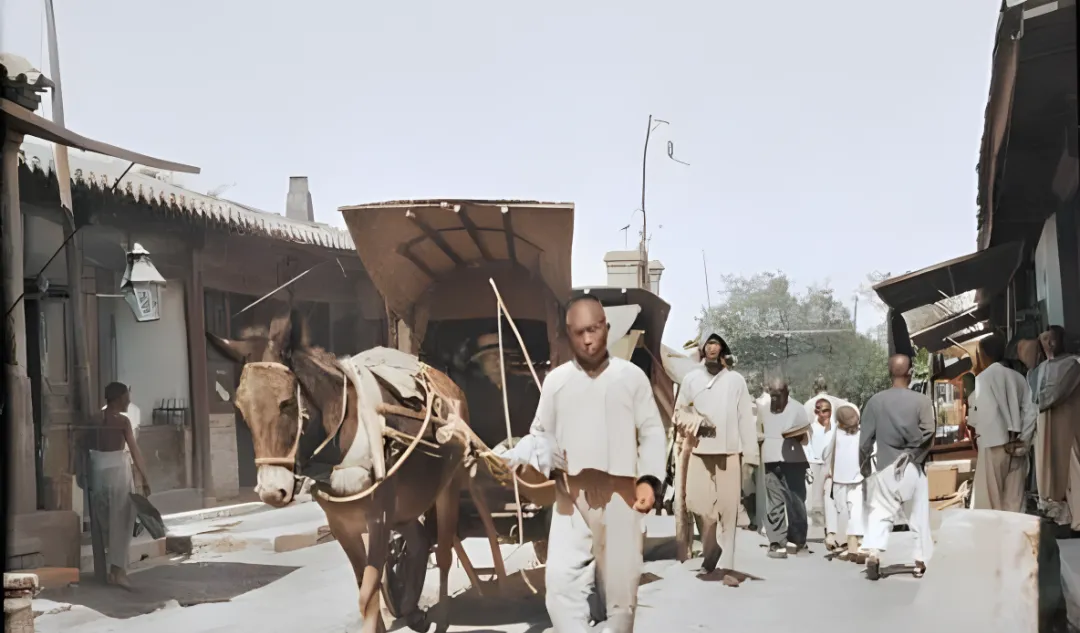 这个顶着布篷的叫骡马车,车厢不宽,弧顶遮阳,前面挽的是只黑骡子,嘴上套了嚼子,脖颈挂着皮垫防磨,车把式手里拄着长鞭,脚下是略微起灰的青石路,街旁铺子招牌垂着,行人绕着车背走,孩子抬头看篷里,像想探究车厢是不是能通到另一个世界。