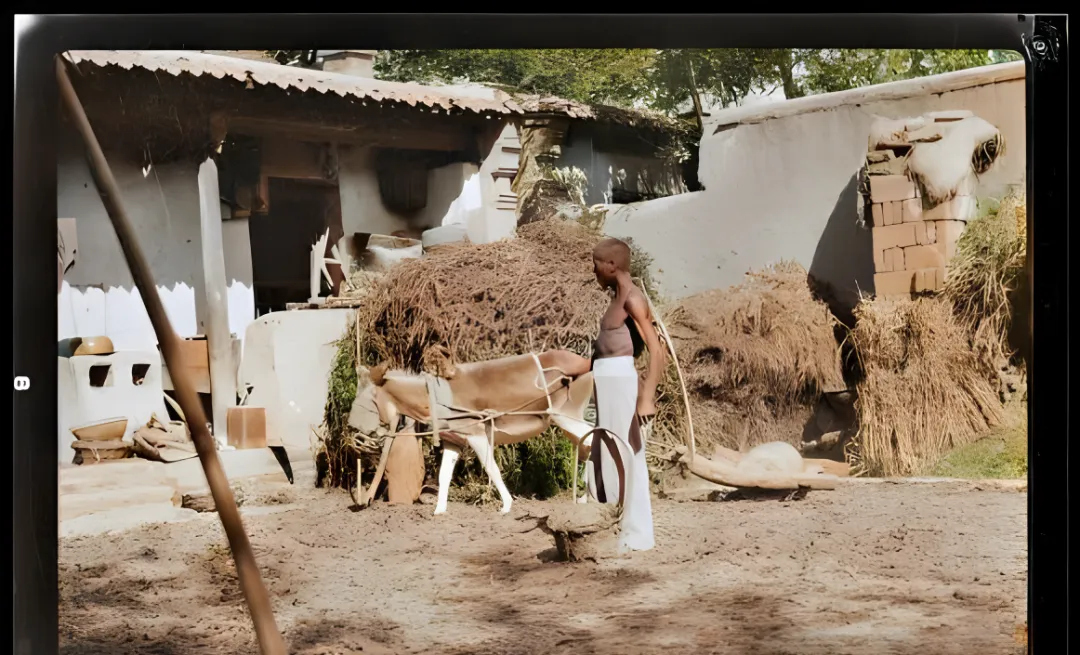 这个弯着木梁的农具叫曲辕犁,前头拴在一只小毛驴的肩胛上,肩背压着皮垫,勒得紧,旁边那圆圆的木盘是石碾的部件,墙角堆着玉米秸和柴把子,地里新翻过,泥面起着细碎的絮纹,男人赤着上身,手按犁把,脚下的劲儿往后沉,犁尖顺着他的呼吸扎进土里。