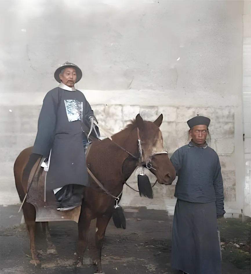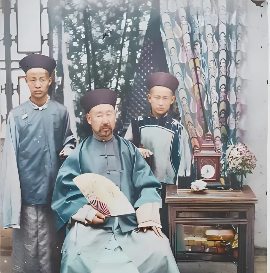 图中这张屋内合影里,案头那台红木底座的西洋钟最扎眼,钟面白净,金指针细长,旁边一只水烟壶静静地靠着,官员端坐,手捏一把折扇,袖口翻得宽宽的,料子看着润,后头两位随从一高一矮,站得老老实实,奶奶说,这钟可新鲜玩意,摆在屋里不光看点儿,还显得主人见过世面,过去请客吃茶,钟一响整点,主人慢条斯理起身招呼,场面就齐整了。