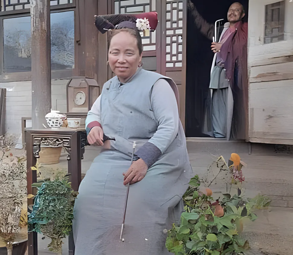 这个笑得开怀的女人,头上架着旗头,横轴宽阔,木胎漆面,插着绢花,手里细细一根烟杆亮汪汪的,院口一张小几上搁着盖碗和小摆钟,丈夫在门槛边探出半个身子,冲镜头挤眉弄眼,妈妈说,一家人忙完了活儿凑在院子晒个背,女人叼上一口,男人就爱逗她,说别抽太猛咯,你还得做晚饭呢,日子苦也甜,笑纹都是真诚的。