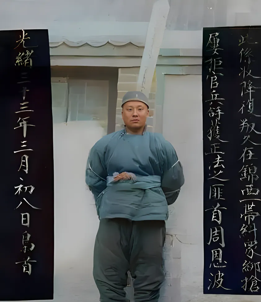 图中这个被绳索勒住腰腹的男子,背后竖着两块黑底白字的牌子,标着年月与地点,眼神却冷静,像把心事叠好收进袖里,这种立定照是行前照,既是凭据也是告示,爷爷说,过去衙门讲究程序,留影不是风光事,却也能给后来人一个交代,现在讲法度,记录换成了案卷和电子档,照片的分量却还在心里压着。