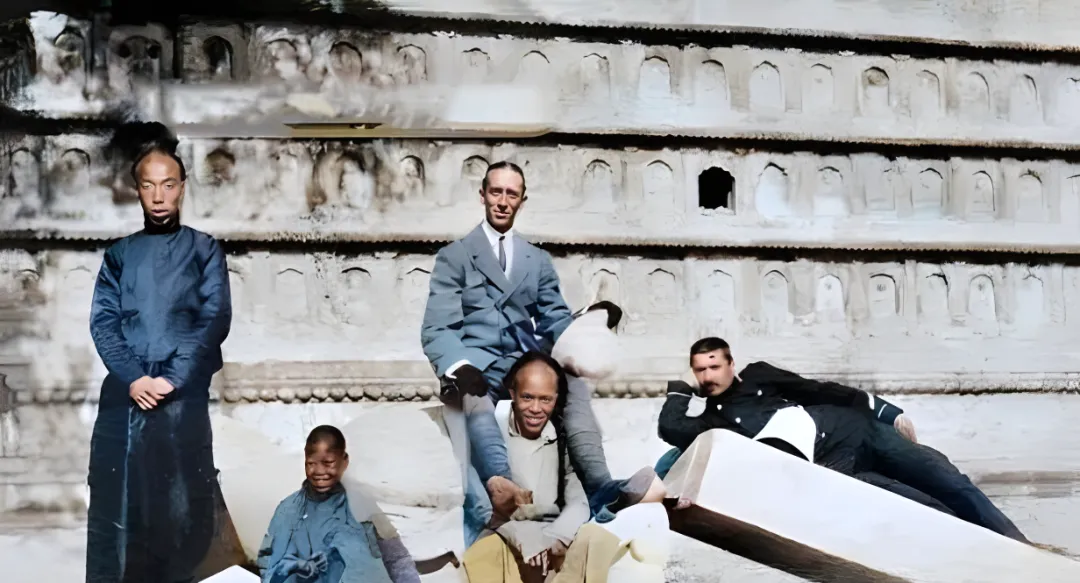 这一张更像路遇的合影,石塔的龛格一层层叠下去,几个人姿势不一,有人正襟危坐,有人干脆侧躺着打趣,左边那位穿长衫的本地人把手攥得紧,袖口里露出一点掌心白,表情却不多给,像在心里打量对方,外来人的西服纽扣亮亮的,鞋尖翘得俏皮,照片里谁也没说话,气氛就这样停在半中央。