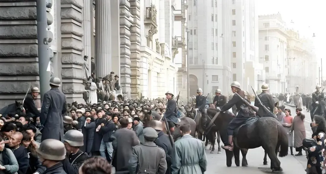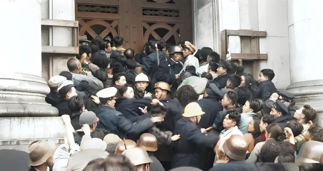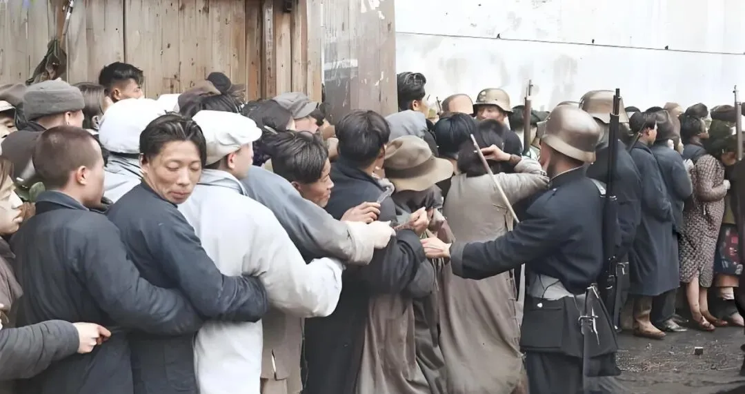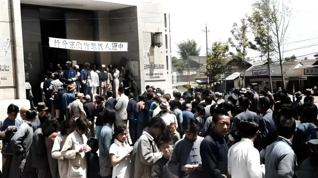 这几张都是换券的日子,门口排起长蛇,队伍一会儿被风吹乱,一会儿又被兵警挤拢,帽沿压得低低的,手里攥着票儿不敢撒手,孩子被大人夹在胳肢窝下,眼神直勾勾盯着门口的牌匾,谁都想先进去把事办妥当。