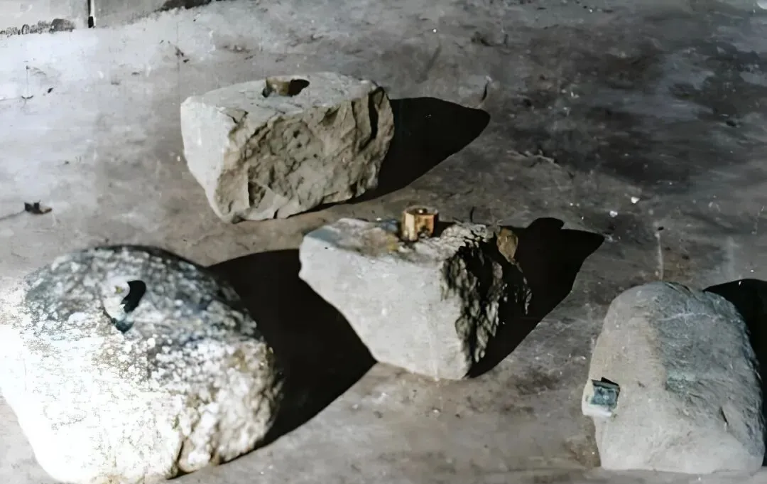 图中这几块不起眼的石头叫石雷,外表糙得很,疙疙瘩瘩的青灰面儿,中间却藏着眼儿,里头安着雷管和装药,外沿抹泥封口,干透就跟院角的垫脚石一个样,放在河滩、土路口、村口碾道旁,都不扎眼,民兵抬着篮子,表面上是挑粪挑柴,实则把石雷一点点送到埋设点,动作得细,手背绷着筋,谁都不敢喘粗气。