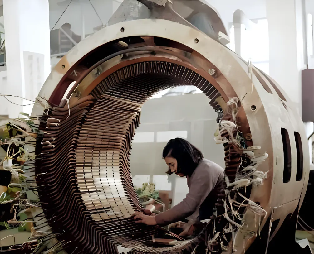 图中这圈巨大的铜色线圈叫电动机定子,外壳像一只没合上的铁灰色布偶,肚里全是规整的硅钢片和绕组,女工弯着腰把一条条扁铜线压进槽里,手里捏的木柄小锤咚咚敲,声音闷而实在,旁边挂着的棉线头和绝缘布边子,像刚拆封的包裹还没来得及收拾,她小个子钻进大机器里头,袖口挽到手肘,细细把每一道线角理顺,劲儿不大,耐心可真大。