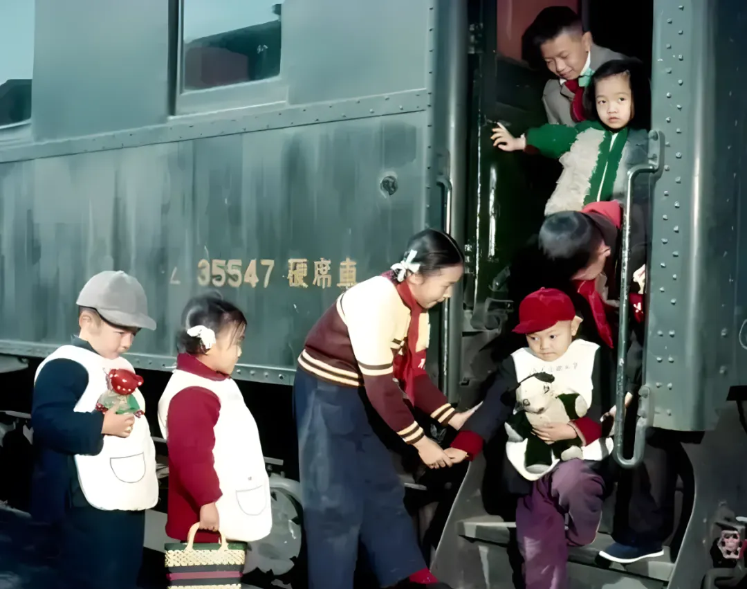 妈妈说那会儿坐火车要提前备干粮,热水瓶贴着胸口捂着,车厢里最值钱的是位置,等车的功夫就有人把旅客信息写在小黑板上,现在手机一晃便知去向,地上醒目的黄线提醒“请勿超越”,可那点人挨人互相照拂的暖意,还是得从这张图上找。