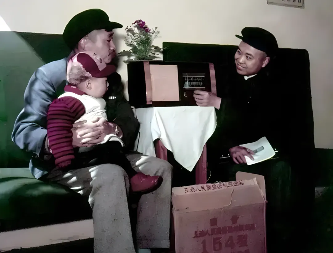 这个方方正正的木匣子叫收音机,木皮纹路直溜溜,正面一道横条刻度,指针在里面挪来挪去,旁边旋钮一捏一拧,指甲会蹭出轻微的咔嗒,茶几上铺块白边小台布,像是专门给它留的位子,父亲把孩子横抱在腿上,朋友笑着示范该怎么调到“上海人民广播电台”,忽而飘出来一段评弹,屋里所有人都安静半拍,像被细线牵住了耳朵。