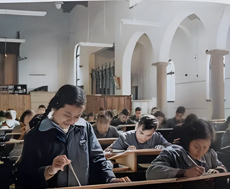 这个一排排长桌叫制图台,斜面合着身高,木边磨得圆润,尺子压着描图纸,铅笔尖蹭在纸面上沙沙响,青年们低着头,眼尾都冒出小光点,前排的师姐笑了一下,把橡皮揉成小坨塞在指缝,随时准备把多余的铅灰轻轻按掉,墙上高窗透下一束冷亮,落在每个人的手背上,像给“认真”两个字打了下划线。