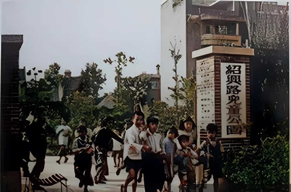 这个立在路口的牌子叫儿童公园的门碑,砖红底子托着黑字白边,院子里一圈梧桐树,影子滴滴答答落在地面,孩子们衣裳朴素,袖口干干净净,追着一只纸球从左到右一溜烟,脚背踢起来的灰像从照片里跑出来,长椅上有人摆着手绢扇风,旁边的小弟弟踩着影子走路,生怕踩漏了个角。