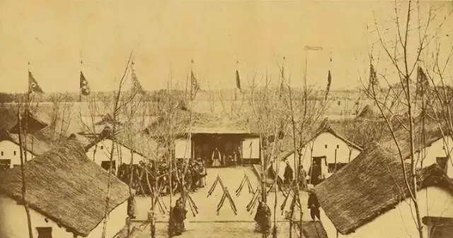 这排整齐的茅顶小屋是营舍,旗杆子一字立着,兵丁在院里列队换岗,门口的长枪成捆靠墙,想象一下夜里打更声一断一续,锅灶里咕嘟着黑面糊糊的粥,左公的兵就是这么熬出来的硬骨头。