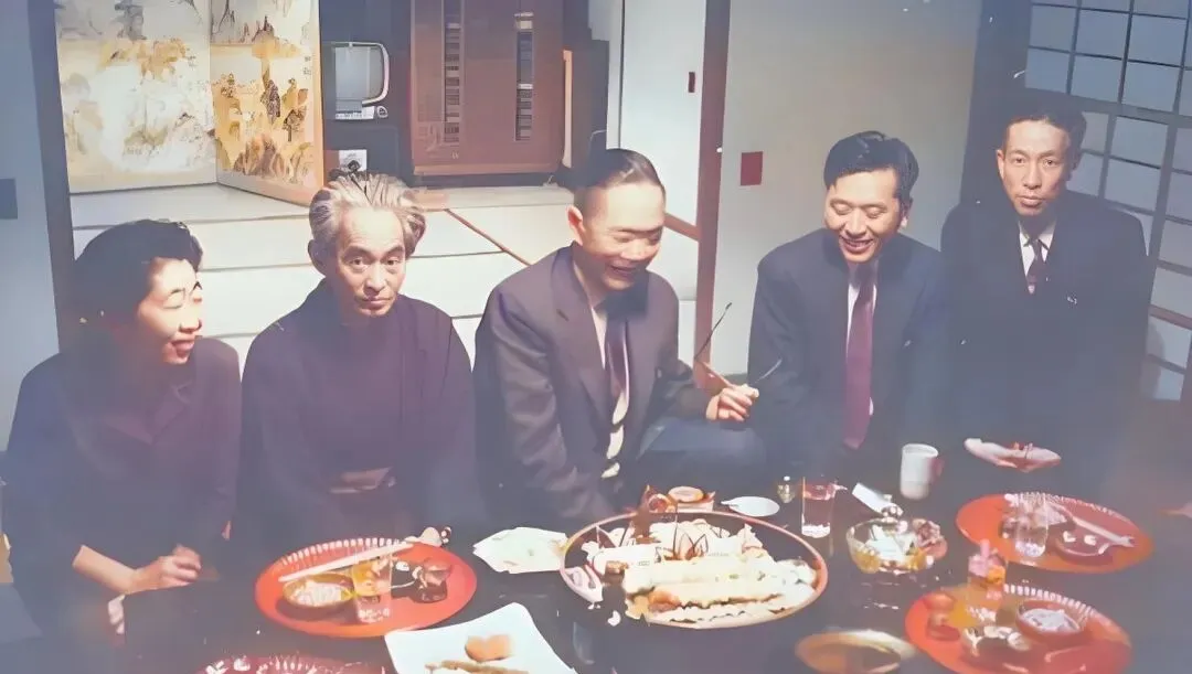 这张围桌的画面,叫会面餐叙更合适,漆托盘一圈摆开,鱼鲜卷着白气,茶杯靠着筷架,屋内榻榻米与木格门把光线切得很柔,几位坐姿各异,有的正襟危坐,有的笑着把筷子举到半空,像是刚说到兴头上。