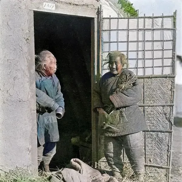图里这两位站在土屋门口的老人,脸上全是风霜刻出来的沟,衣裳蓬起一层土灰,手里还攥着一把枯草,奶奶说,那阵儿人穷,风从缝里灌过来,门背后垫的是麦糠袋子,夜里谁要是打了个喷嚏,第二天就得烧锅热点水暖暖身子,现在煤气一拧就着,取暖讲的是温控曲线,想起那时候的冷,心里还是发紧,可他们站在门口的眼神又很直,像把日子当成一块硬饼,就着风也要咬下去。