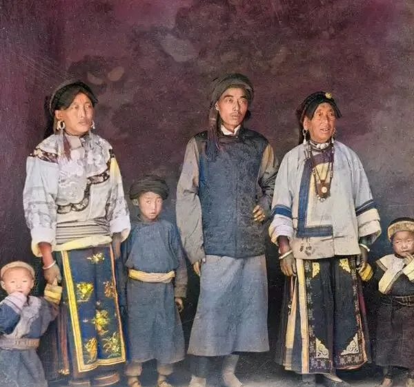 这个一家子穿的叫藏族服饰,长袍宽大的袖口垂着,腰间束带结在一侧,女眷耳畔的金色圆环亮得很,胸前挂坠在暗紫的底子上更显沉,孩子们的帽沿绣了细细的纹路,奶奶第一次见这样的装束是在戏台子后面,看得目不转睛,小声嘀咕人家这颜色会挑,衣料是粗呢混着细软的里衬,冬天把一只袖子空着裹在腰上,方便干活,也能把暖气攒在胸口,现在旅游照片里见得多了,可真到高原风口站一会儿,才知道这些衣服不是花巧,是对寒凉的应对。