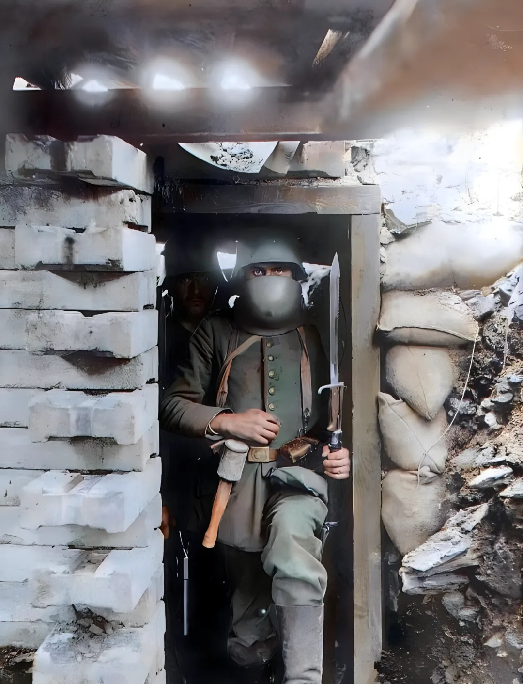 图里这身铠色制服叫野战装,呢料外套配金属扣,腰间挎着皮制弹包和水壶,靴面打着旧蜡,最显眼的是刺刀寒着光,头盔边缘被泥水蹭出一道亮线,门洞是木梁和白砖砌的,顶上还有冒白气的缝隙,像刚喘过一口粗气的胸腔。