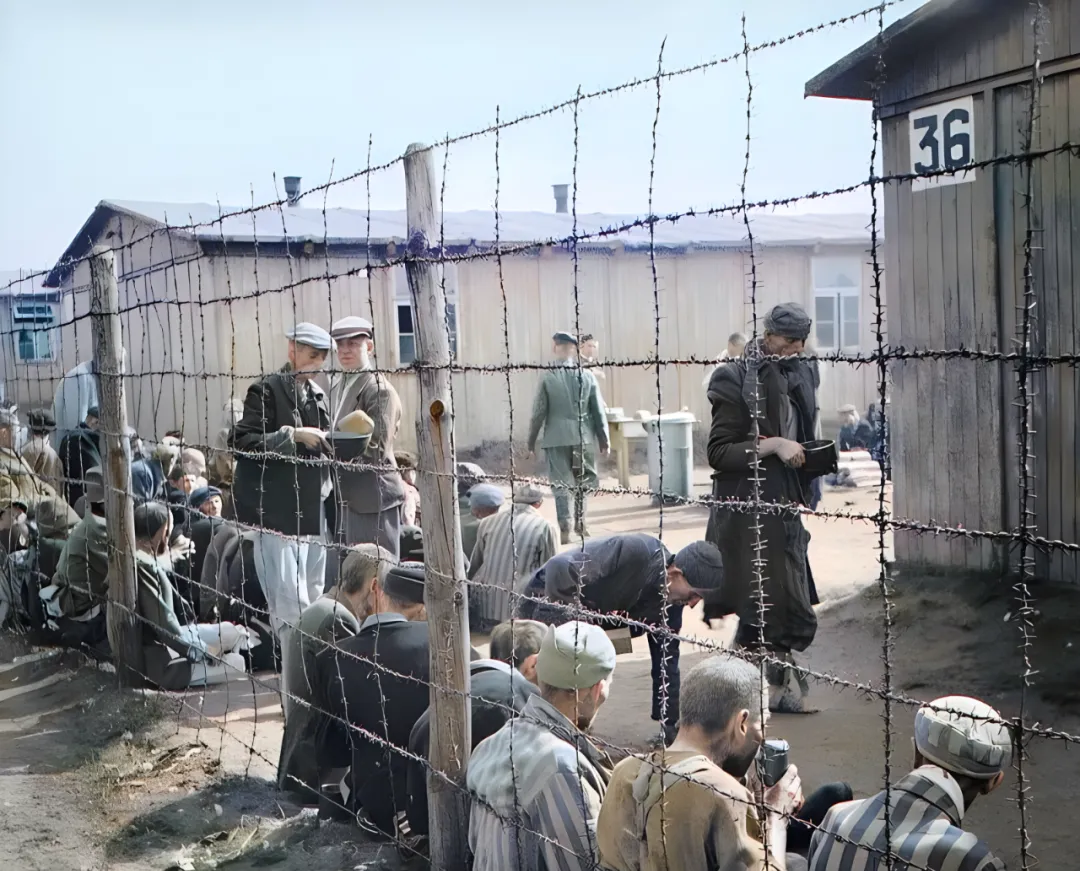 图中这排带倒刺的铁丝网叫蛇腹网,柱子是木桩,阴影落在地上像格子,把人影切成一块块,里面穿条纹衣服的人蹲坐着排成行,有人端着碗,有人把背佝着,阳光亮,可颜色一亮,冷意更实在。