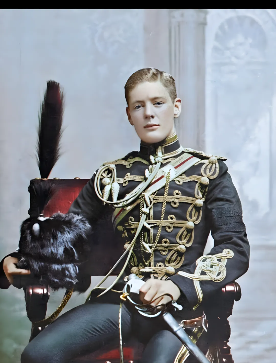 这个年轻人穿的是礼服骑兵装,黑呢底上缀着金色织带,打成一朵朵结,肩章挺立,腰间系军刀,刀把包白革,另一手按着一顶黑毛羽饰的军帽,坐椅是红绒面,靠手包着木纹的亮漆。