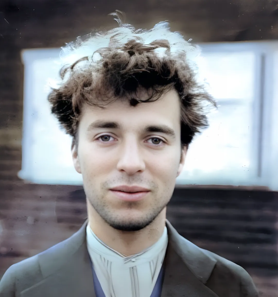 这张近景里,卷发蓬松,前额有几缕被风掀起来,下巴薄薄一圈须茬,眼睛清亮,领口是竖褶的浅色衬衫,外头罩一件深色外套,背后木墙和一扇小窗糊着光。
