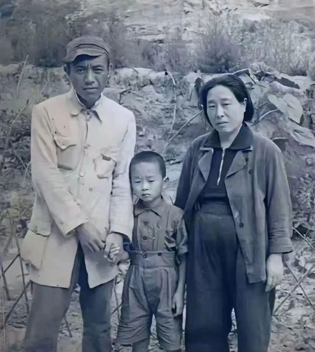 这张合影里的三口人站得紧紧的,男人的军帽压得很低,手却牢牢握着孩子,女人的上衣褪了色,腰间一圈褶子,是那会儿常见的粗布,背景是土崖和枝桠,风一吹就能刮脸那种,照片里的沉默不用配字你也懂,日子虽苦,站一块就踏实,妈妈看了笑说,那时候一家人拍一次照得商量半天,攒好衣裳再去镇上,回来路上舍不得坐车,省下钱买盐和煤油。