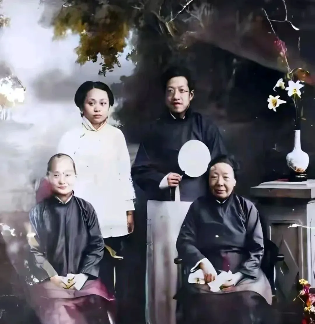 图中摆拍的叫影楼全家福,站着的两位穿黑色大褂和浅色长衫,手里还捏着一把团扇,坐着的两位安静地托着手帕,旁边一只白瓷花瓶插着百合,花瓣泛着亮光,老影楼就爱这点讲究,桌上一块台布,后面再拉一张朦胧山水背景,人物一字排开,规矩得很,可你仔细看,最小的那位嘴角提着笑,像是刚偷吃了点心。