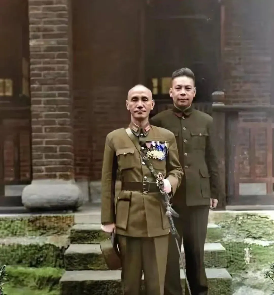 这个场景一看就是院子里台阶前的留影,前面的人军装笔挺,胸前挂满勋表,手里握着军刀,腰带打得正,后面那位站得方,神态里有股亲近又克制的劲儿,砖墙青苔顺着台阶往上爬,说明这地儿潮,拍完估摸着还得擦鞋,那时候讲究仪式,穿上礼服就该把背挺直,照片一按,就成了家里柜顶上最醒目的那张。
