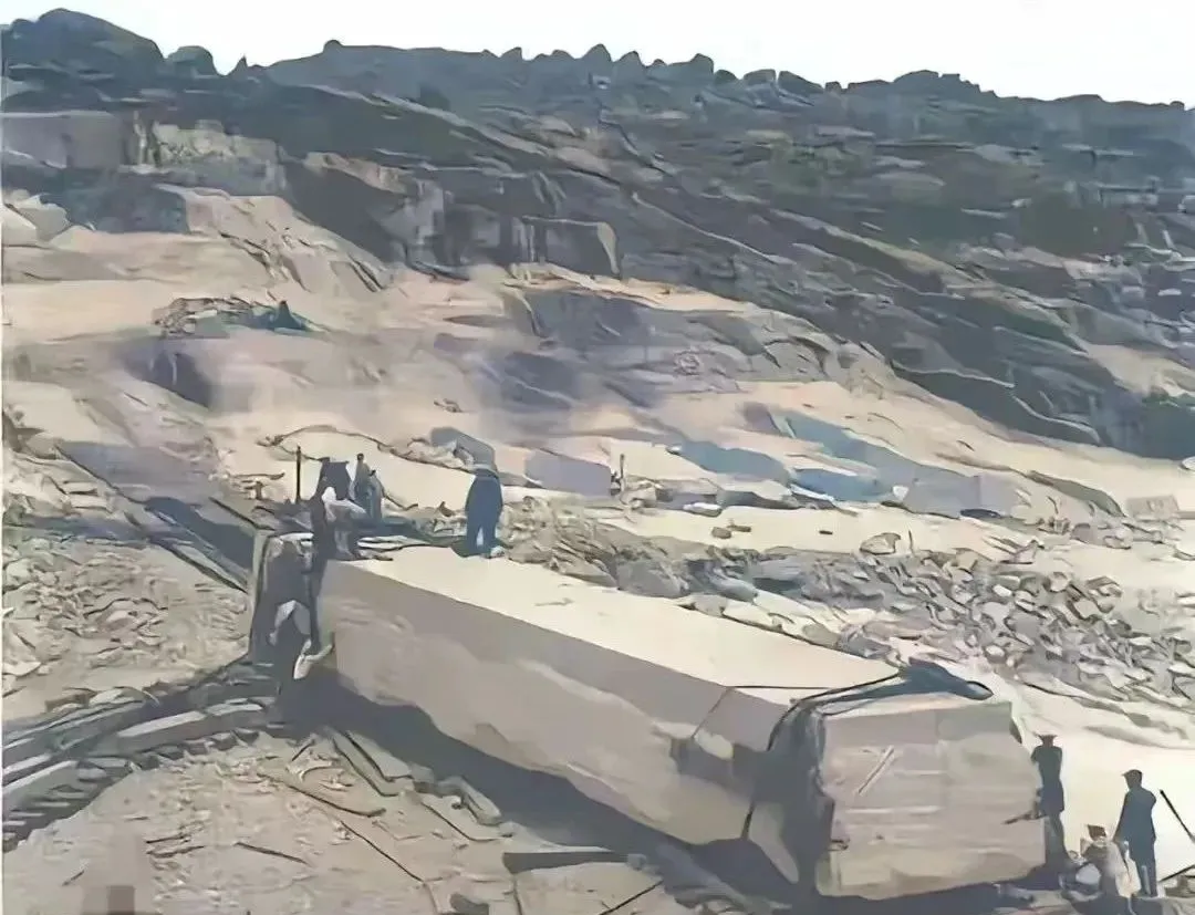 图中这块大家伙叫碑心原石,躺在山坡下像一艘方头木船,边上人影忙前忙后,木轨顺势铺开,石面被修得平整,棱角分明,听老舅说,花岗岩要挑纹理直的,硬度够,打眼、塞楔、浇水,石头咔咔作响,等它顺着理子裂开,一群人合力撬动,心都提到嗓子眼儿,这一方石要是运到城里去,再打磨再上字,那就是能立在风里一辈子的东西。