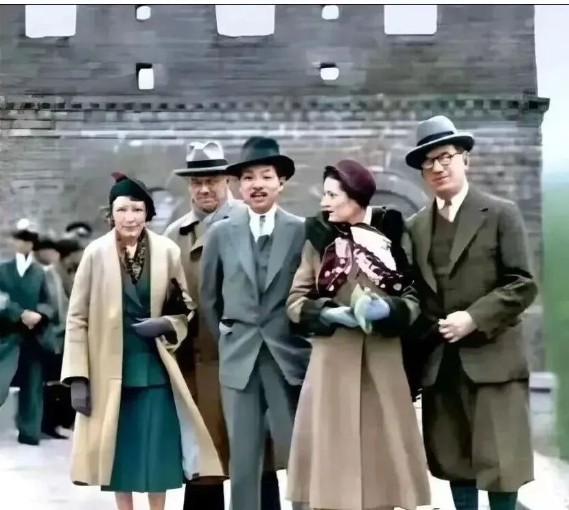 图中这处城门口就是熟悉的长城敌楼,老砖缝里卡着风沙,灰青色的城墙衬得人更精神,前排几位,呢子外套挺括,袖口的手套是当年出门应景的小讲究,礼帽压得很正,帽檐一遮,脸上那点腼腆劲就有了,北平春寒料峭的时候,城上风刮得紧,拍这样一张合影,得有人喊一声看镜头,大家一齐收住步子,快门一按,神情就定在这一刻了。