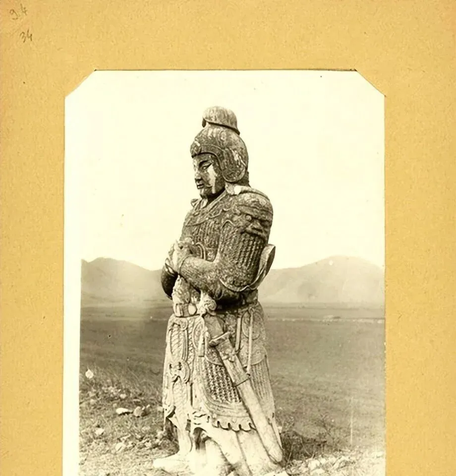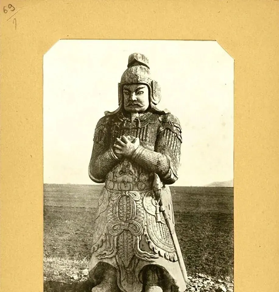 另一个武将像,手握刀柄,额甲贴眉,肩甲外翻像鱼鳞,风把草掀成一片浪,站他脚下,心里自然就收住了,这种“收”,古人最会。