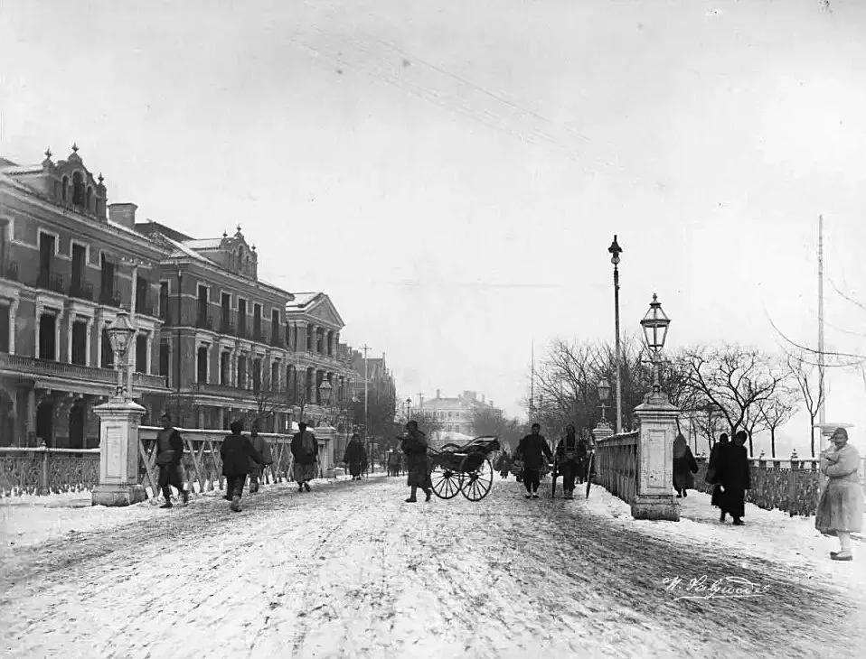 1893年1月,上海迎来了“超级寒潮”。史料记载:“黄浦江、吴淞江、淀泖(即淀山湖)等江湖河港皆冰,累日不开,经旬不解,人行冰上。”这幅老照片恰好记录了当时的场景,外滩上的人们行色匆匆,面对镜头好奇却不慌张。