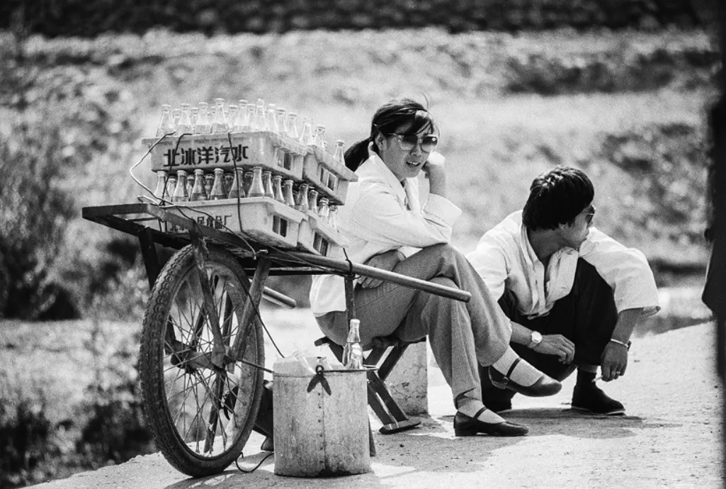 照片中,个体户脸上的“蛤蟆镜”透着他们对时代变迁的敏感与追从,而且还故意留着镜片上的商标,以证明墨镜的“身份”。独轮车和旁边用于冰镇的水桶,也在诉说时代的变迁。改革开放改变了人们的生活方式和生命状态。