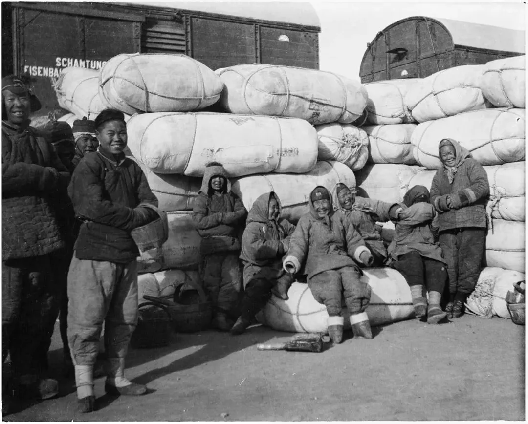 坐在棉包上的妇女都是缠足的小脚女人,面对照相机镜头,她们看上去很放松,甚至很快乐,只有一位年轻一点的女性遮了脸,从旁边拉她的人的表情看,她遮脸似乎是害羞,而不是害怕。相较于迷信会被照相机摄走魂魄,我们可以看到她们观念的变化。