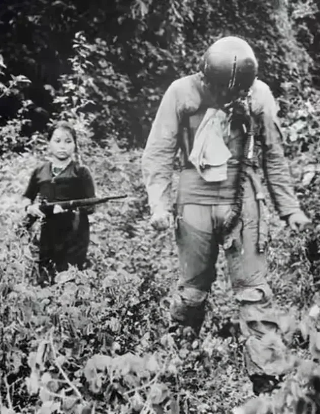 一名越南女孩押解着一名被俘的美国飞行员。