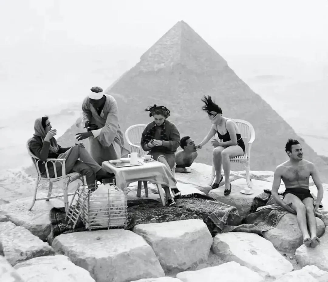 1938年,游客在埃及金字塔顶部喝茶。