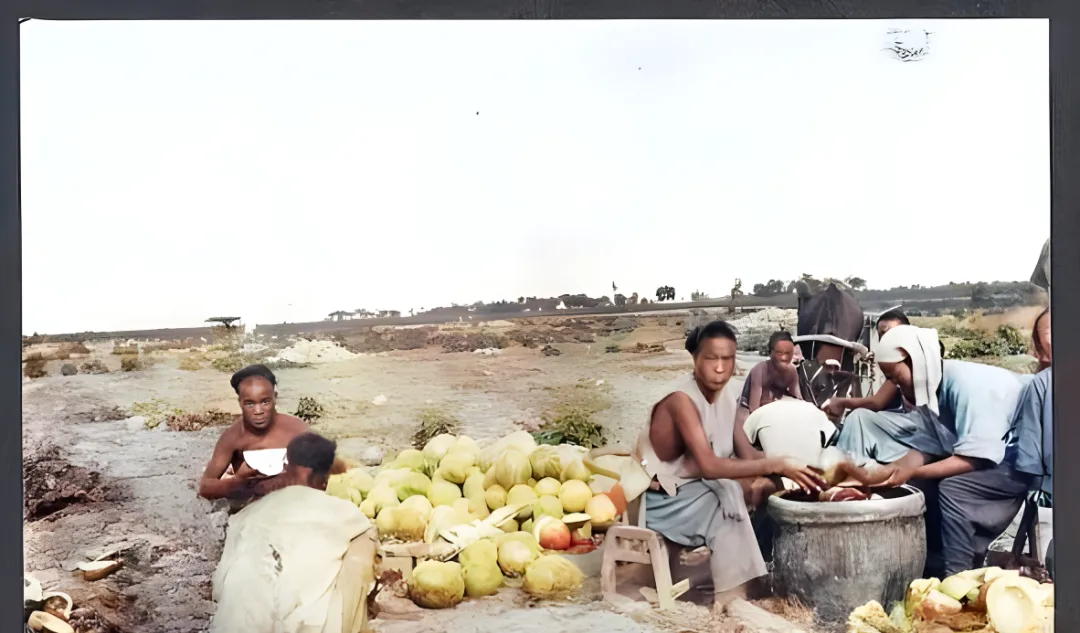 图里这一堆堆圆滚滚的绿疙瘩叫西瓜,皮色发淡,夹着一丝土黄,都是露地里结出来的实诚货,旁边的大缸是先人爱用的灰陶缸,口沿厚,缸肚饱满,手一摸冰凉疙瘩的,瓜一刀下去,红瓤冒水,坐小矮凳的人把瓜瓤撬进缸里,孩子在一旁抿着嘴等着分一瓣,赶车的骡子低头喘气,缰绳搭在车辕上,地上散着瓜蔓和瓜皮,都是当时的味道。