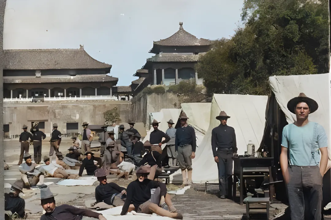 这片白花花的不是市集,是军营,帆布帐篷一排排,木箱子、铁灶台、折叠床杂乱却有章法,石板路上人或坐或躺,帽檐压得很低,远处殿檐挑出飞角,琉璃瓦被阳光一蹭,就知道这地儿不一般,偏偏被当成了营地,照片里没声音,但你能想见铁器碰撞的脆响和靴底敲石的噔噔声。