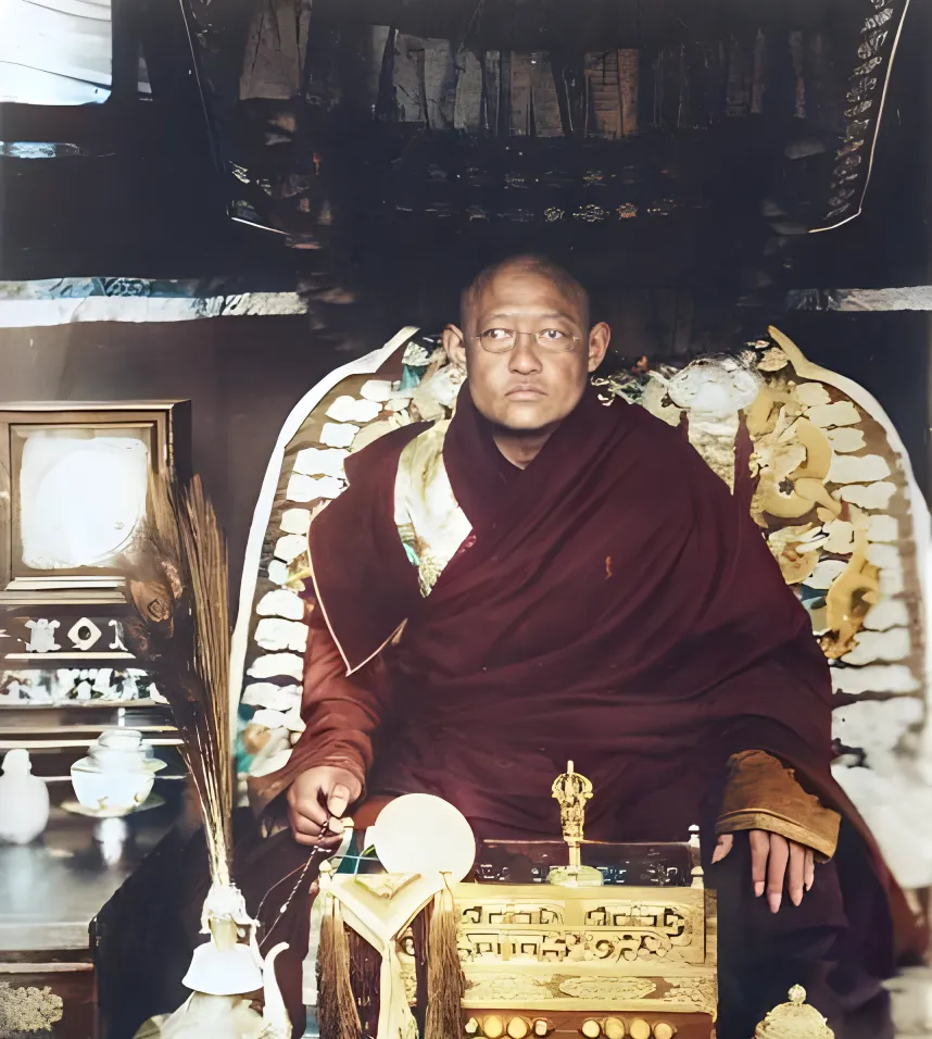 这张里桌面上一溜金铜器,转经轮、嘎巴拉碗、羽扇一样不少,法座的靠背高高耸着,背后贴嵌着亮片和布条,红褐色袈裟厚得像毯子,边角补着暗金镶边,眼神不对镜头,却像穿过你看别处去了,有人说宗教照严肃,我看更像是守规矩,手里捏着流苏的那一下,绳穗被指肚一搓,轻轻颤了下,屋里一定很静,静得能听见油灯跳火的细响。