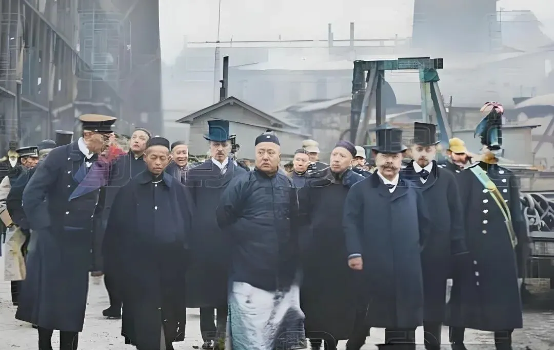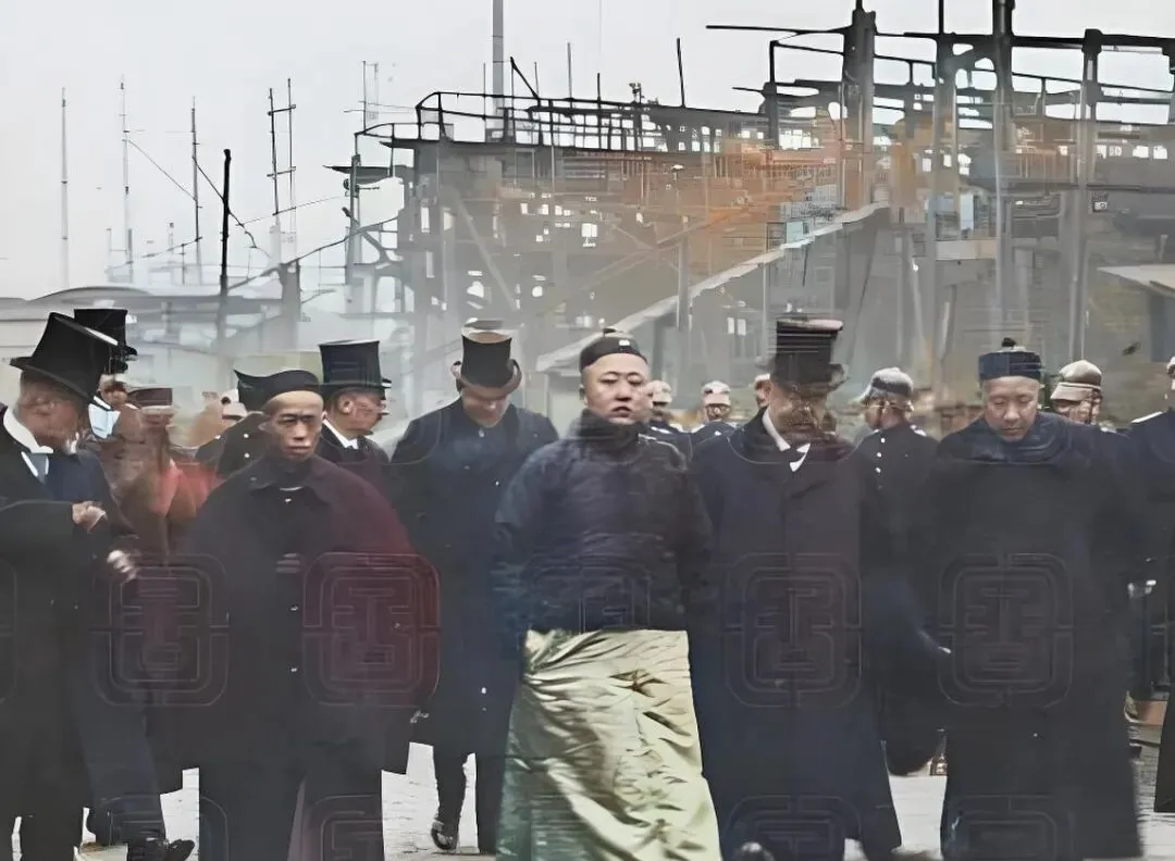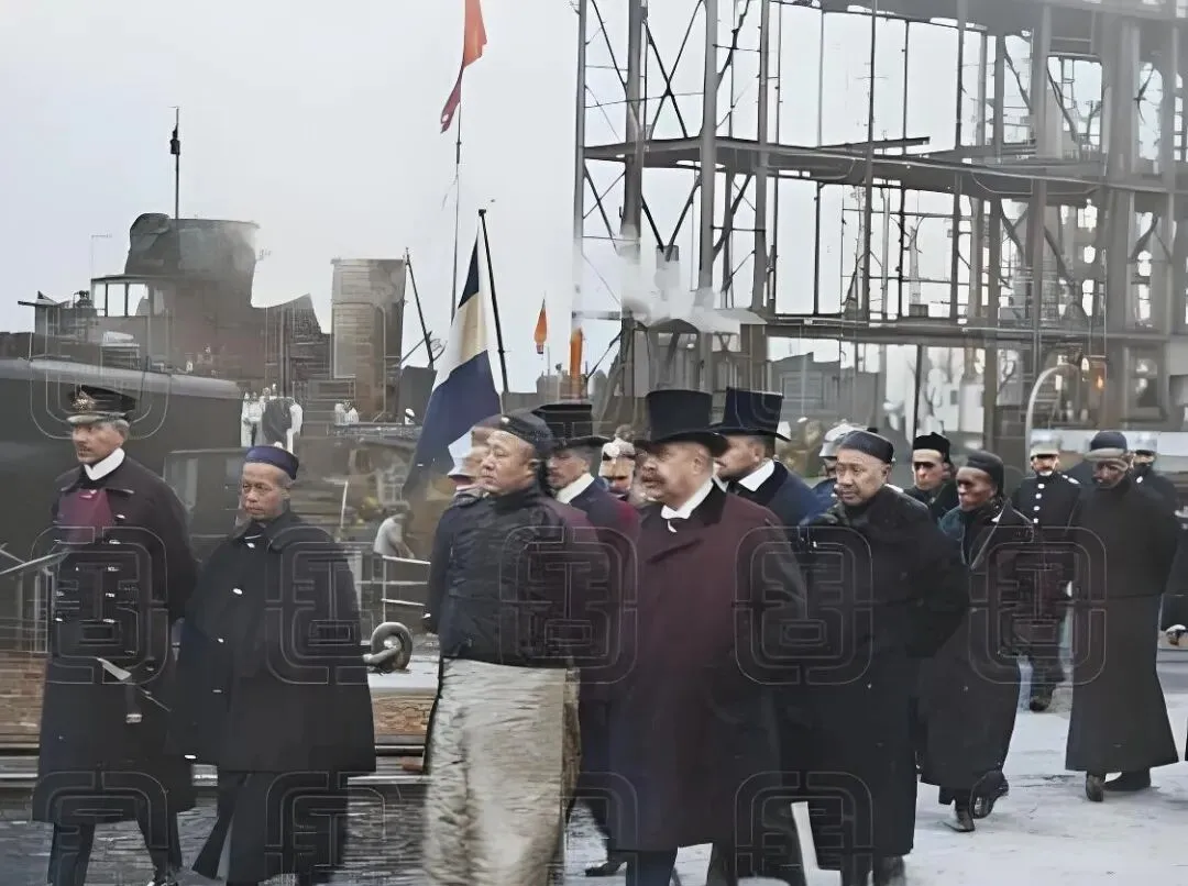这几张里的人群一色呢绒大氅高礼帽加瓜皮帽混在一处,这个场景叫考察船厂,图中前排中间那位正走在潮湿的滑道边,脚下像是还带着船台油渍的反光,周围是灰色钢梁和起重桅,冷飕飕的海雾把背景糊成一片,这会儿看上去安静,其实热闹得很,造船的铆枪声隔着镜头都能想象出来,考察团在意大利德国英国之间穿梭,站在舷边量尺寸问价钱,谁家的装甲厚几分,谁家的锅炉冒烟更顺,他们一边翻图纸一边算账,最后下单订驱逐舰巡洋舰和炮舰,这些名词在书上看着抽象,到了船台边就都有了分量和响声。