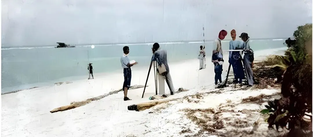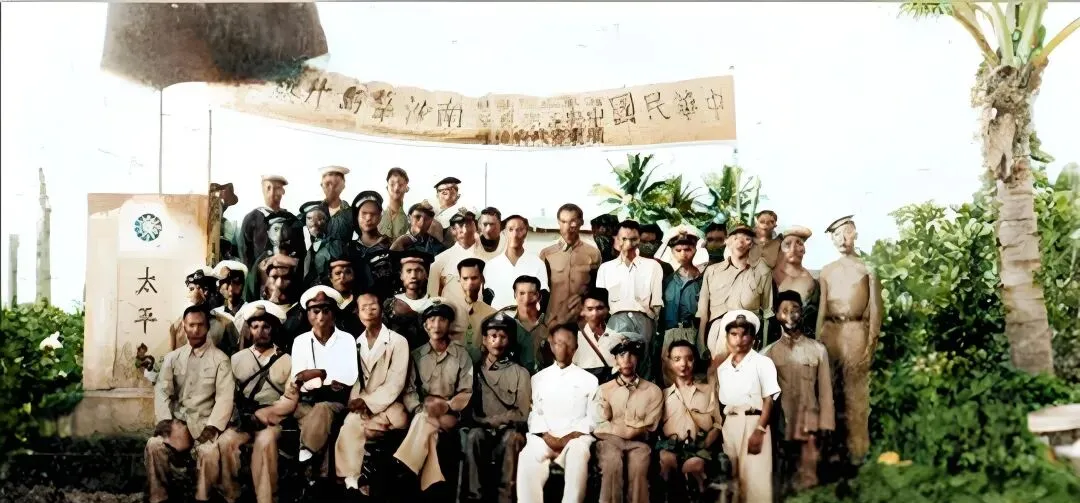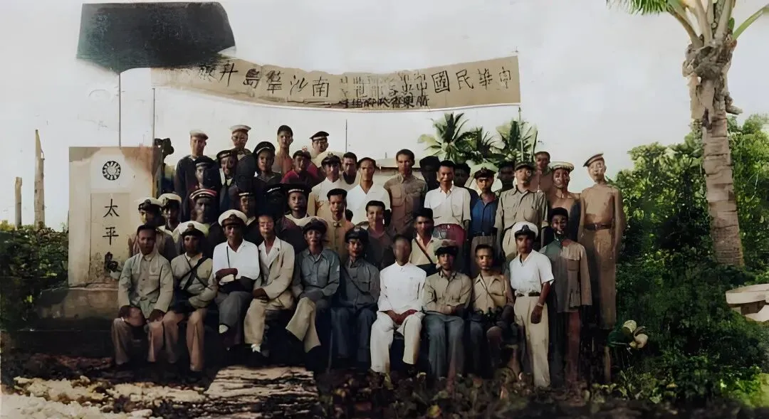 这两张合影最好玩,前排坐满了海风晒得黑亮的面孔,后排横着拉了一条布横幅,左侧立着一块白色碑石上写着“太平”,这个场景叫到达和宣示,船靠岸,人上岛,先摸一圈看淡水井和海潮,再树碑合影留档,镜头不花哨,却把一座岛从地图上拎到现实里,奶奶看见这类照片常会说一句“人到哪儿旗就插哪儿”,朴素但明白。