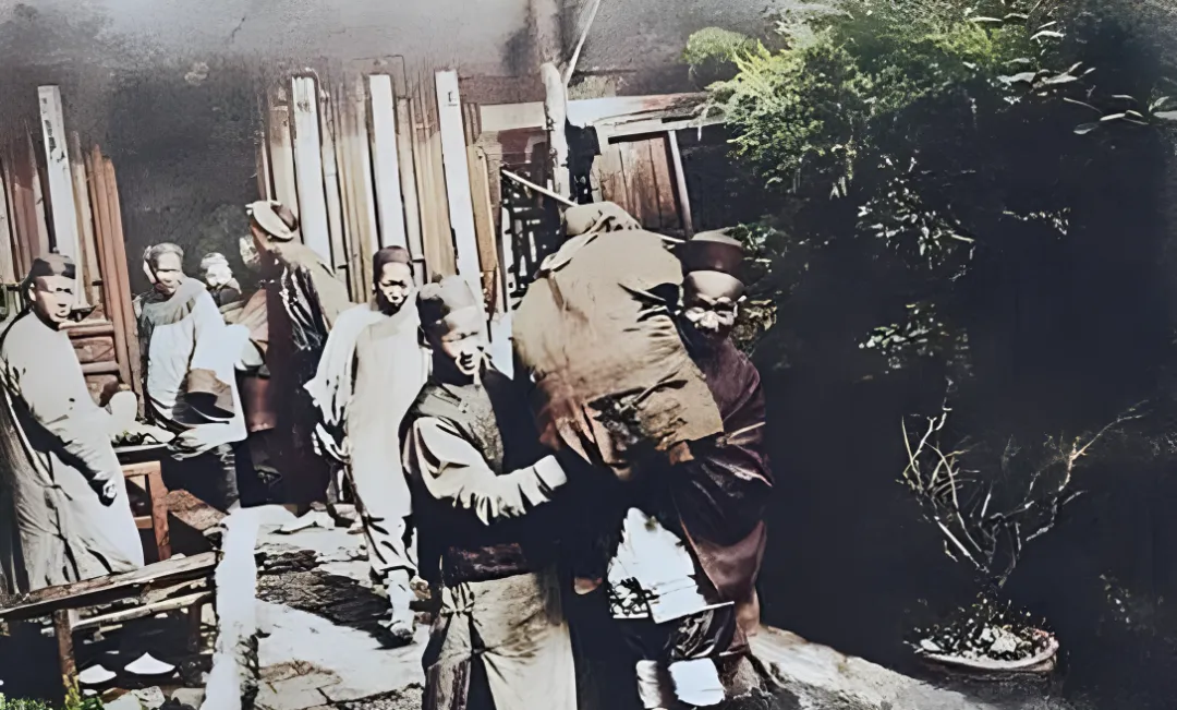 清末上色老照片:女子脱鞋展示畸形的双足;晚清婚礼纪实;焚烧鸦片的禁烟现场。