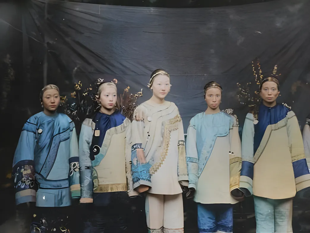 这几位头上的窄头巾叫抹额,缎面发亮,边上或绣海水纹或嵌珠花,衣裳是宽袖袄,前襟滚边,颜色一水清淡得体,站成一排谁也不挤谁的位置,镜头里能看见一种安静的讲究,奶奶看这张照片时笑着说,这袖口宽,吃饭不小心就蘸汤了,得用荷包把袖子别起来才干净,现在的流行一年三变,那时候一身体面能穿好多年。