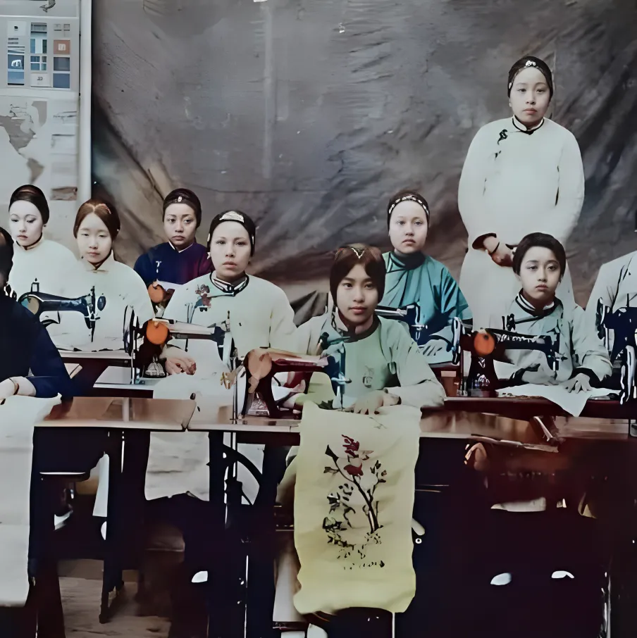 缝纫机课堂前排挂着一条绣样巾,胭脂红的花瓣在淡黄布上开着,女孩的手指捏着线头,指肚有被针尖磨出来的硬茧,踏板的节奏像一支曲子,整屋子此起彼伏,谁一乱拍子,老师就轻轻咳一声提醒,简单的两个动作把一身衣裳成形,放到现在也不过分,手上功夫这个词,不兴废话。