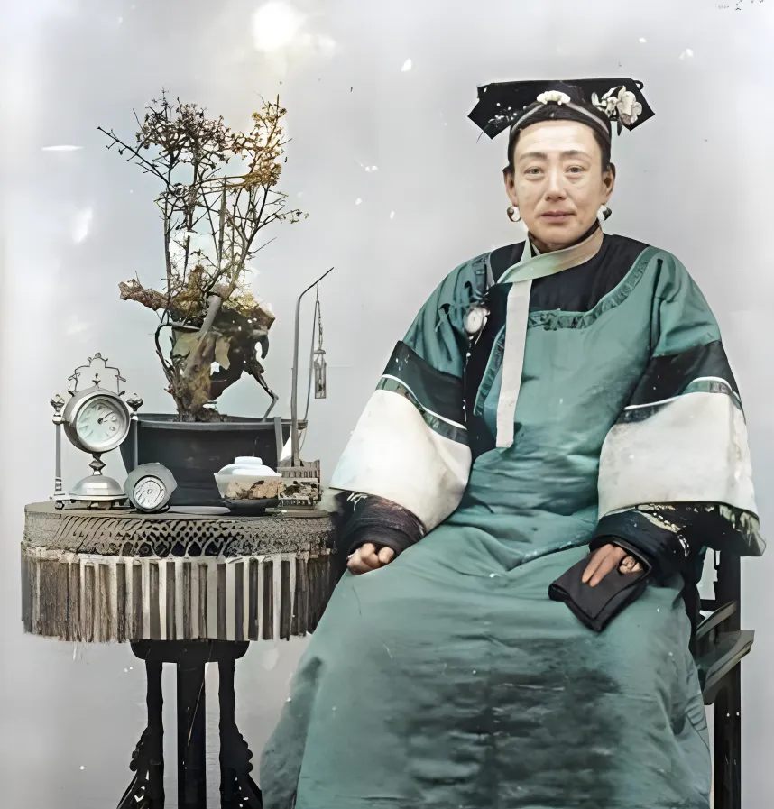 桌上那只圆面钟叫台钟,白面黑针,金属壳子反着冷光,旁边摆了细脚花瓶和小木匣,女人坐得端正,衣袍领口和袖口都滚着宽边,时间在钟面上走,在她脸上也走,照片的妙处是把两种节奏放在一张纸里,开眼看世界这四个字往往就靠这些小物件撑出来,现在家里随便一块电子表都能掐准秒点,可这只台钟摆在那儿,就是有一种体面生活的意味。
