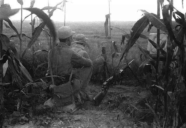图:山坡上的一块玉米地里,八路军埋伏在这里,准备打一场伏击战。照片中我们能看到的武器装备有掷弹筒、“歪把子”(大正十一式轻机枪)。