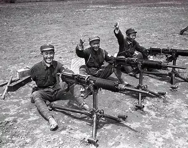 图:三名八路军战士展示他们使用的武器,每人一把重机枪,型号是日军九二式重机枪。