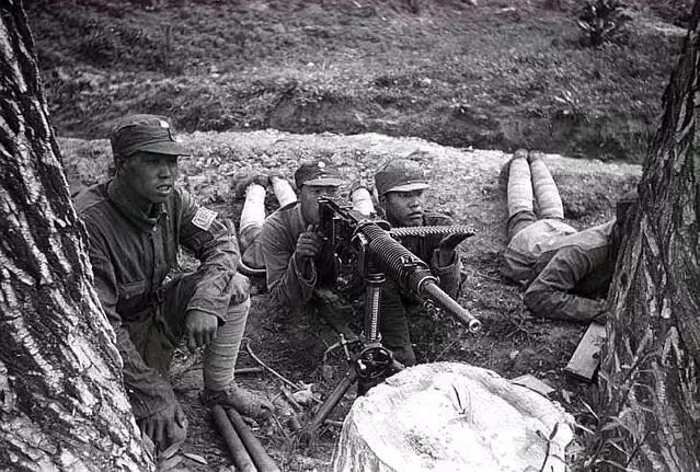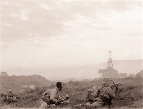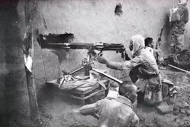 1940年8月,八路军将士们趁着早晨涌起了的薄雾,向井陉煤矿发动攻击,照片中是八路军的机枪阵地,他们正在与鬼子作战。